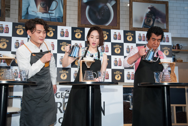 会場の虎ノ門ヒルズカフェには、ゲストとして、俳優の藤岡弘、さんと筧美和子さんが姿を見せた。藤岡さんは、自身でコーヒーをプロデュースするなどのコーヒー通として知られ、筧さんはカフェ好きのコーヒーファンだ。藤岡さんは「海外ではコーヒーでもてなされることが多く、その経験からハマった。最高のコミュケ―ションツールだ」、筧さんは「初心者だが、カフェの雰囲気が大好き」と話した。大塚氏が、おいしいコーヒーを入れるポイントは「何よりも準備が大切」と説くと、藤岡さんは「役者の仕事も同じ。いい準備をすれば、演技にも深みが出る」と語った。