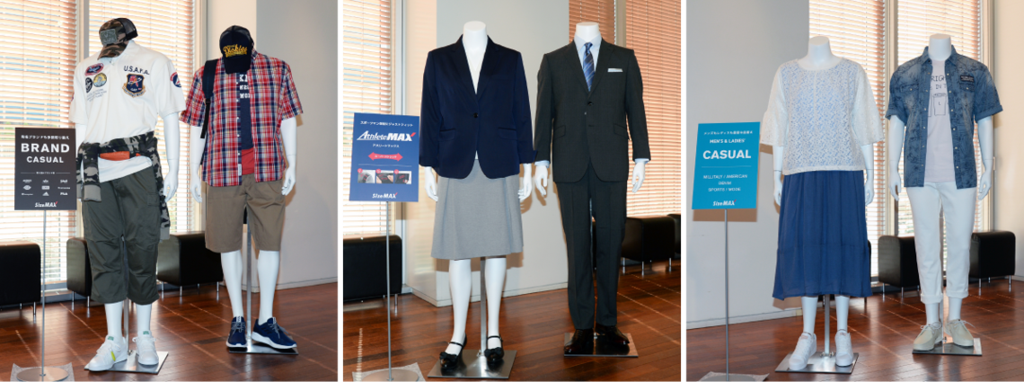 同事業の責任者である佐藤謙氏は具体的な商品として、京都大のアメリカンフットボール部と共同開発した「アスリートMAXスーツ」を紹介。体の大きなアスリートの声を生かし、ストレッチ機能を盛り込んだと説明した。また、カジュアルではレギュラーサイズしかなかったブランドでも大きいサイズのバリエーションを広げると話した。広告・宣伝では「えらべるシアワセ」をキーワードに、テレビCMなどで認知を高め、店舗では広い試着室を用意するなど独自のサービスを提供。今後、取扱い店舗150店を目指す。