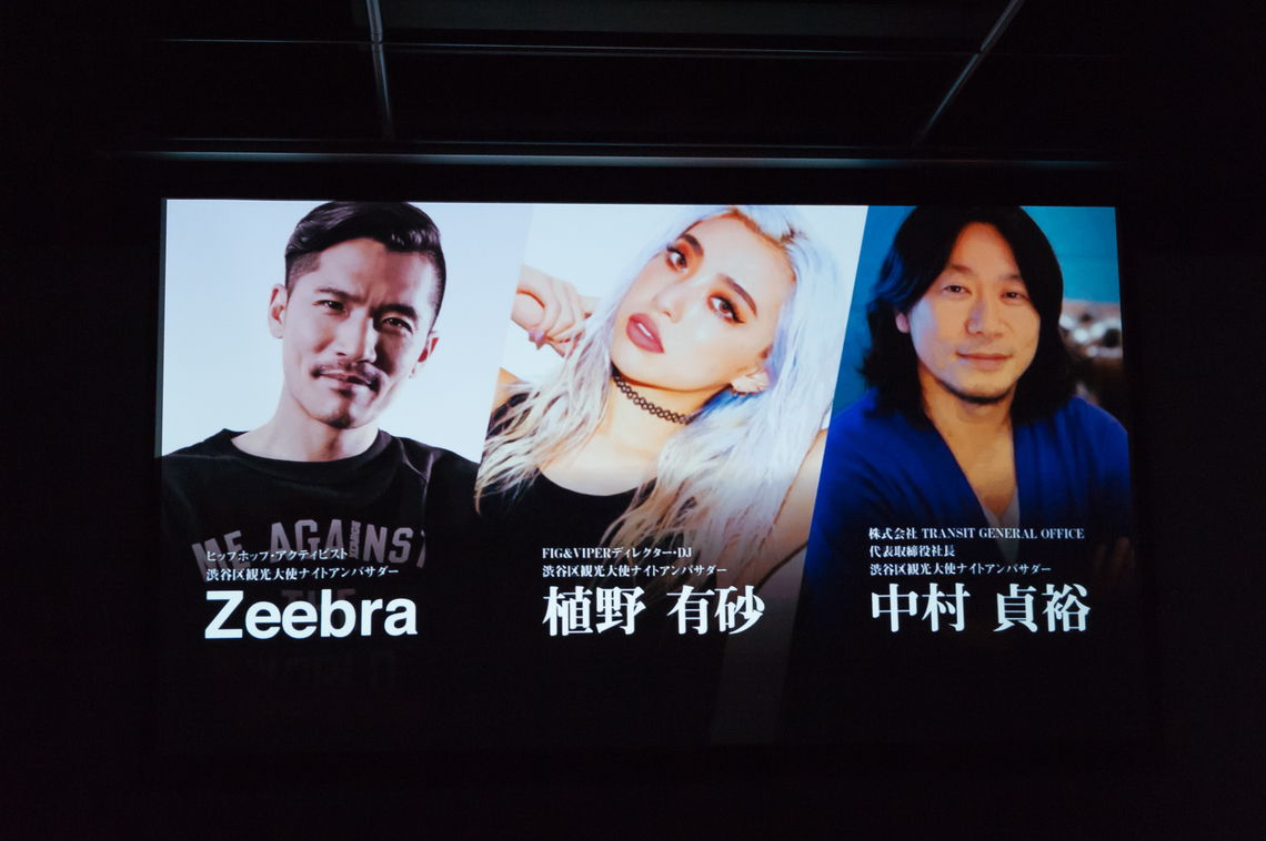 ステージでは、渋谷区のナイトアンバサダーでヒップホップ・アクティビストのZeebra氏と、ファッションブランド・FIG&VIPERディレクター・DJの植野有砂氏、トランジット ジェネラル オフィスの中村貞裕社長が加わりトークを展開した。