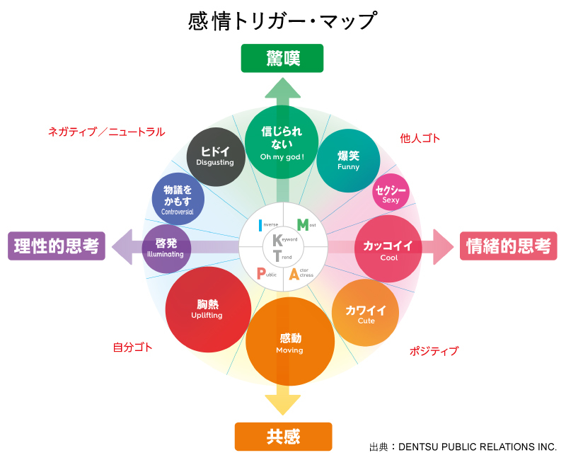 例えば、「感動」「胸熱」を刺激するようなコンテンツが、同時に「Public」つまり「社会」課題を解決するような内容であったら、ニュース性も高く、ソーシャルメディアでもシェアされやすいコンテンツになりやすい、という見方をします。「IMPAKT」と親和性の高い感情をそれぞれ「マップ」内の近くに配しているのです(KeywordとTrendは、どれにも該当するので中央に配置)。