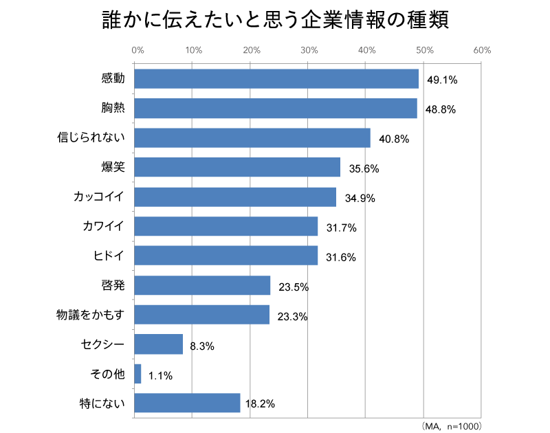 結果は、1位が「感動」(49.1%)で、「胸熱」(48.8%)と「信じられない」(40.8%)がそれに続きます。内容に強い“共感”を持つことができるコンテンツや、そのストーリーに心が打たれて胸が熱くなるようなコンテンツ、自分の想像を超えるような驚き、といったコンテンツに支持が集まるという結果になりました。