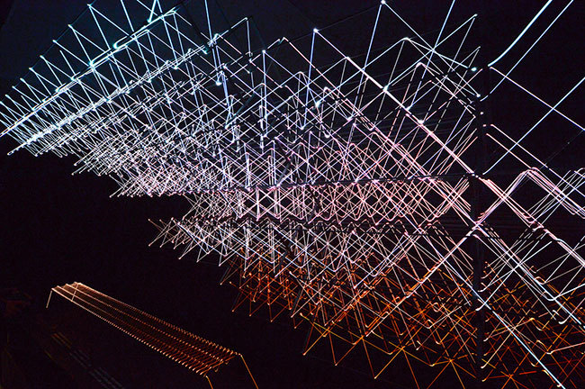 「WEAVING THE LIGHT」は、次世代の光デバイスとして注目される「レーザー」の特性を生かした、住空間の明かりの提案だ。高輝度、直進性、多色制御といった特性を生かすために、ファイバーを応用。糸を編むような手仕事の感性によって、住空間に新たな価値をもたらす明かりと空間がデザインされている。