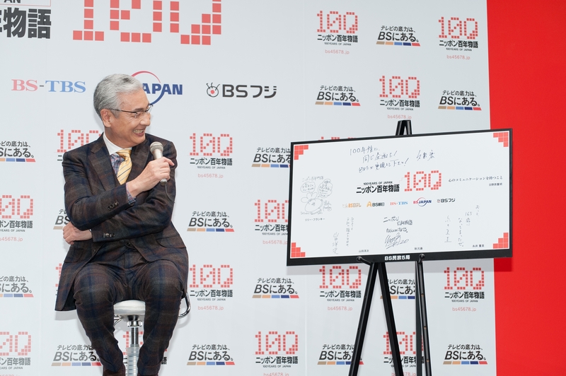 12月9日、東京・中央区の時事通信ホールで番組制作発表会が行われ、久米さんは「100年という時間が長いのか短いのか考えさせられた」と感想を述べ「年末年始は、ゆったりと見られるBSをぜひご覧ください」とアピールした。また100年後のニッポンへ向けたメッセージを求められると「100年後に同じ企画を! どなたか実現してください!」とボードに記した。BS民放5局は同新作以外にも過去に放送した番組と合わせて、年末年始合計110時間以上の特別編成を行う。