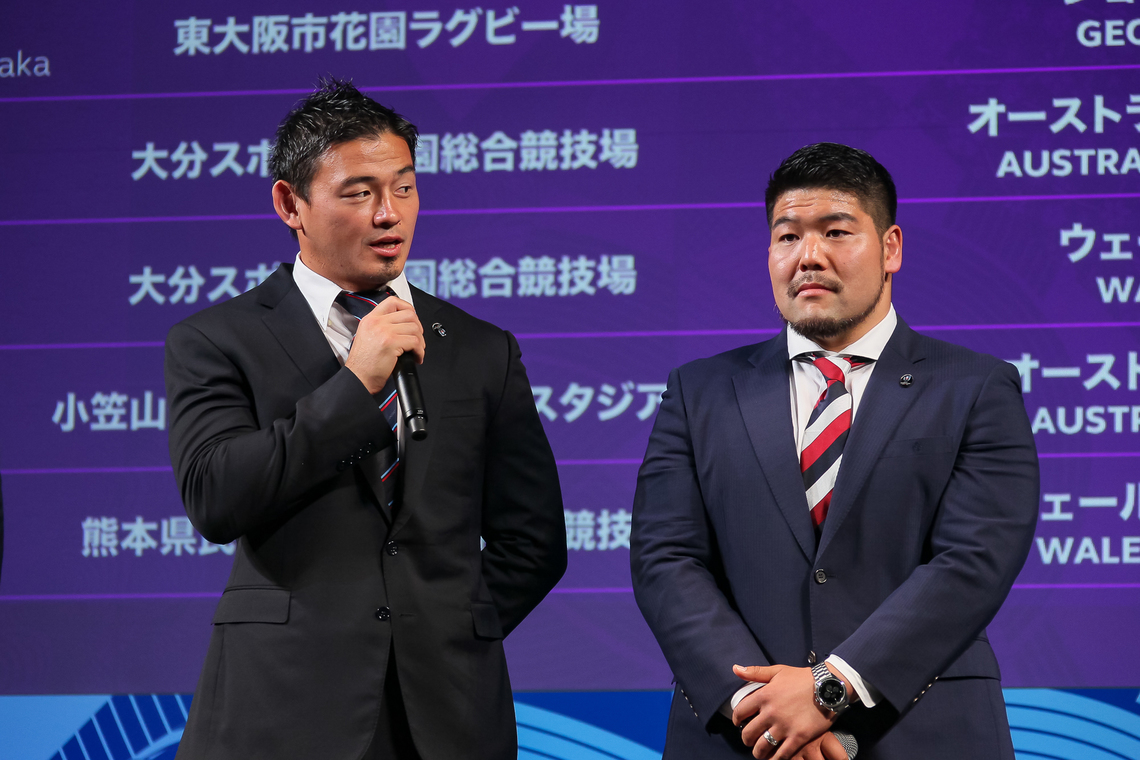 会場では同大会ドリームサポーターの谷本歩実さん(元柔道日本代表)や中嶋悟さん(元F1ドライバー)、松木安太郎さん(元サッカー日本代表)、室伏広治さん(元ハンマー投げ日本代表)、ヨーコ・ゼッターランドさん(元バレーボールアメリカ代表)、そしてアンバサダーを務める元ラグビー日本代表の桜庭吉彦さん、松田努さん、増保輝則さんにより、開幕戦から決勝戦まで、全国12都市・12会場で44日間にわたって開催される全48試合の日程と会場が発表された。