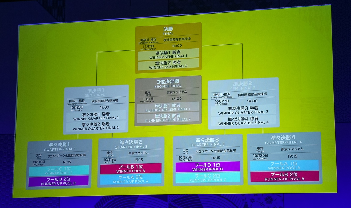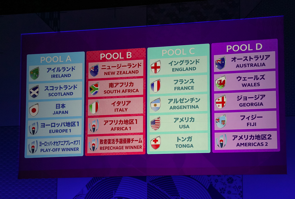 ホスト国でグループリーグA組の日本代表は9月20日、調布市の東京スタジアムでの開幕戦でヨーロッパ地区代表と対戦。その後は9月28日にアイルランドと、10月5日にはヨーロッパ・オセアニアプレーオフ勝者、13日にはスコットランド代表と戦う。