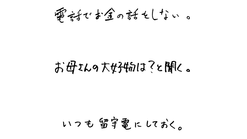 政府広報はこれまで、「親子間の会話を増やす」「周囲の見守り強化」を呼び掛けるキャンペーンを実施してきたが、今回は一歩進んだ対策として、怪しい電話がかかってきたときに家族と事前に交わしておいた「約束」が強力な防止策になることを啓発するウェブ動画を公開した。