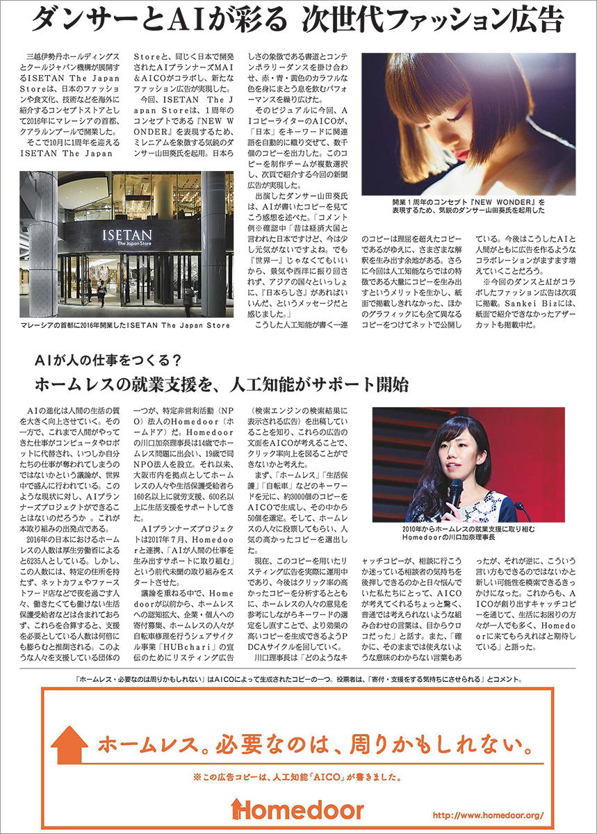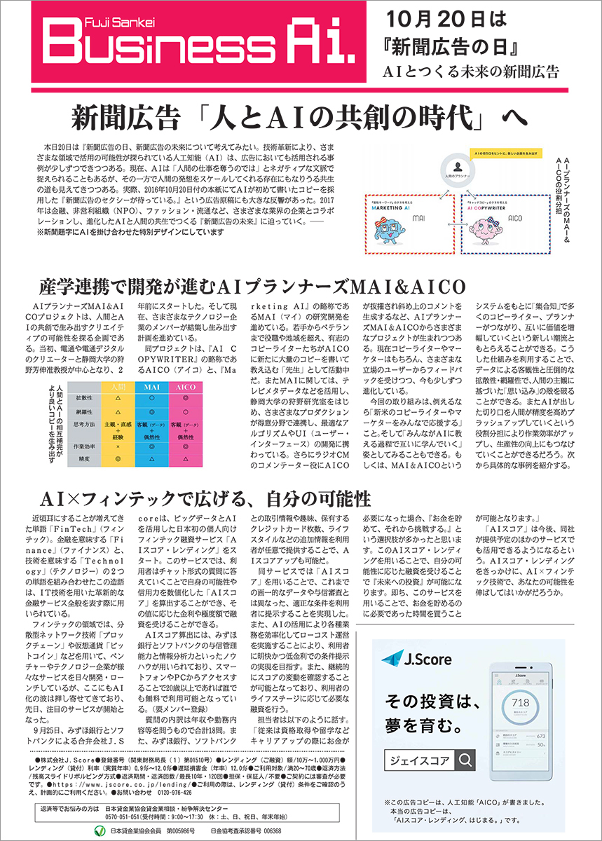 昨年2016年の「新聞広告の日」にAIが書いたコピーを使った新聞広告を掲出し世の中をざわつかせたAIコピーライターのAICOですが、今回はさらにパワーアップしたフジサンケイビジネスアイの「新聞広告の日」企画についてご紹介します。