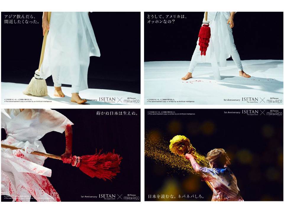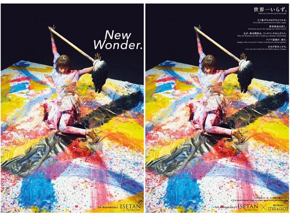さらに、日本に関連したキーワードとして「アジア」「景気後退」「世界」などの話題が自動的に含まれたAICOのコピーを大量に見ていくうちに、これらのコピーをつなげてひとつのボディーコピーやメッセージが生み出せるのではないだろうか?とアイデアが展開していきました。そこで、元々のISETAN THE JAPAN STOREの広告の横に、AICOがコラボして書いたボディーコピーのようなメッセージを対比させて見せていくという今回の新聞原稿が出来上がりました。