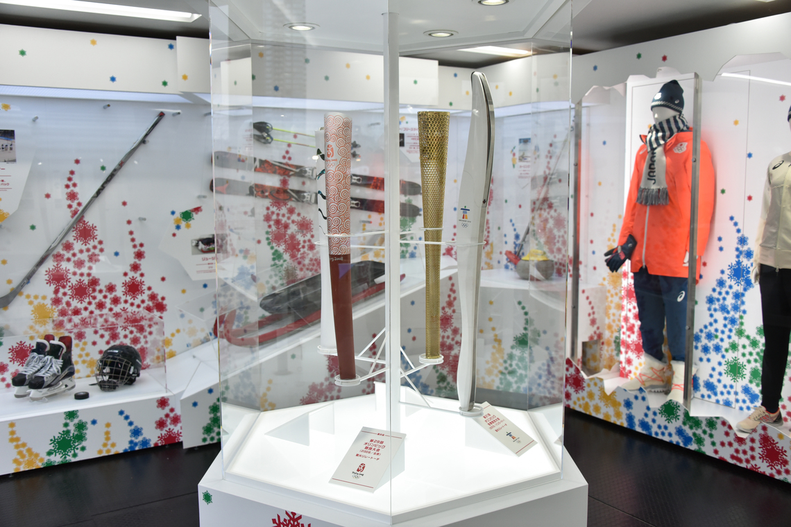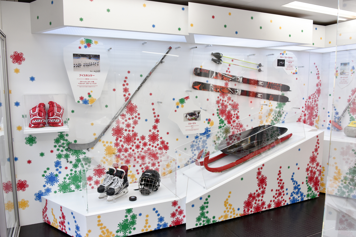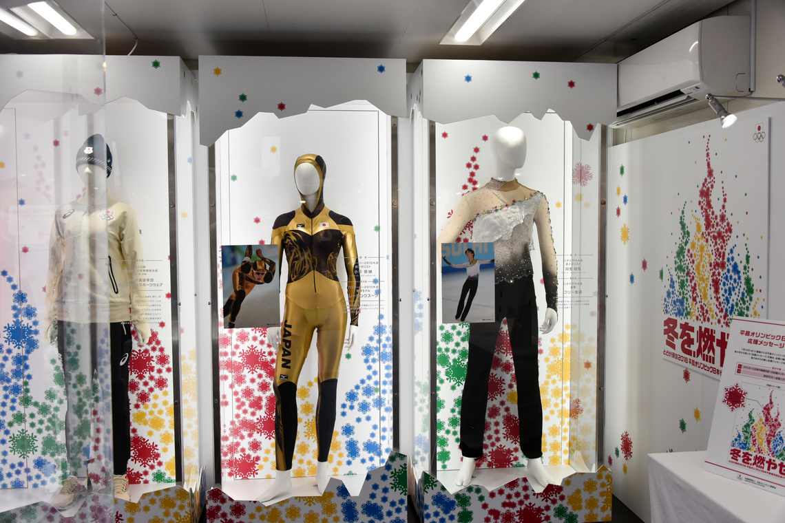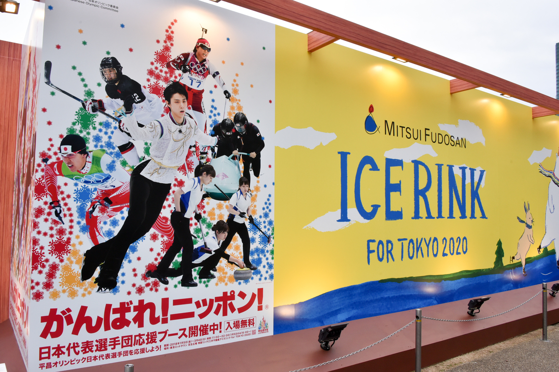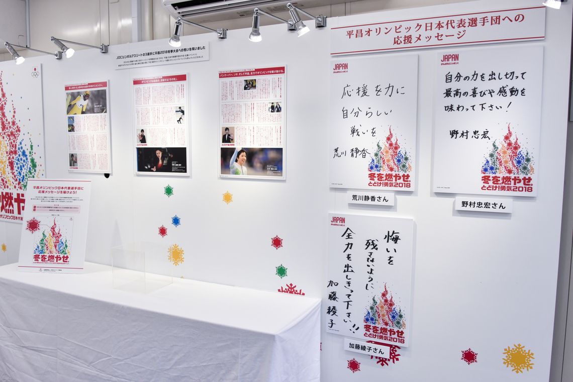 スケートリンク脇には応援ブースが設けられ、冬季競技の用具やスポーツウエア、聖火リレートーチなどが展示されている他、日本代表選手への応援メッセージを記入できるコーナーもある。
