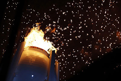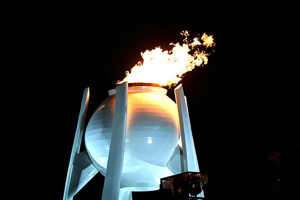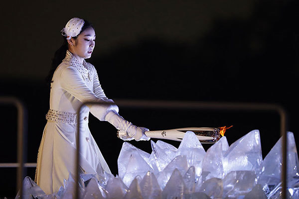 聖火リレーの最終走者は、南北の女子選手で、聖火台の下で舞う元フィギュアスケート選手のキム・ヨナさんに引き継がれた。キム・ヨナさんの点火により炎の輪が上昇し、韓国の伝統的な磁器である白磁のつぼをイメージした聖火台に火がともると、会場はクライマックスを迎えた。