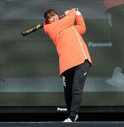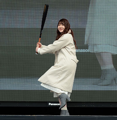 ステージでは、野球ファンであり“神スイング”で有名な稲村さんと、リトル・グリー・モンスターのかれんさんによるスイング・スピード対決が行われた。佐藤さんも挑戦するも、結果は計測器の不調もあり稲村さんに完敗。「本番に弱いタイプなんで」と会場を笑わせた。