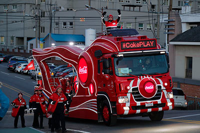 同社は、聖火リレーの公式スポンサーとしても参加。コカ・コーラのトラックがリレーを先導し、メンバーが歌やダンスを披露。沿道の市民を盛り上げた。