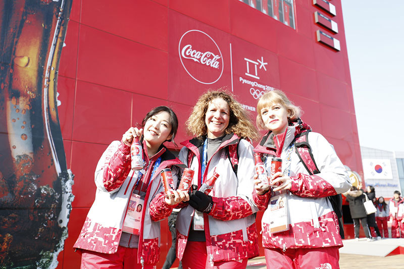 オリンピックパートナーとして最長の歴史を持つコカ・コーラは、両会場で活動している。平昌では、ボトルのオブジェやパネルの前で写真を撮影し、SNSにアップすると賞品をプレゼントするキャンペーンを実施。江陵では、巨大なベンディングマシンを設置。来場者が大きなコインを入れると、商品がマシンから落ちてくる仕掛けだ。