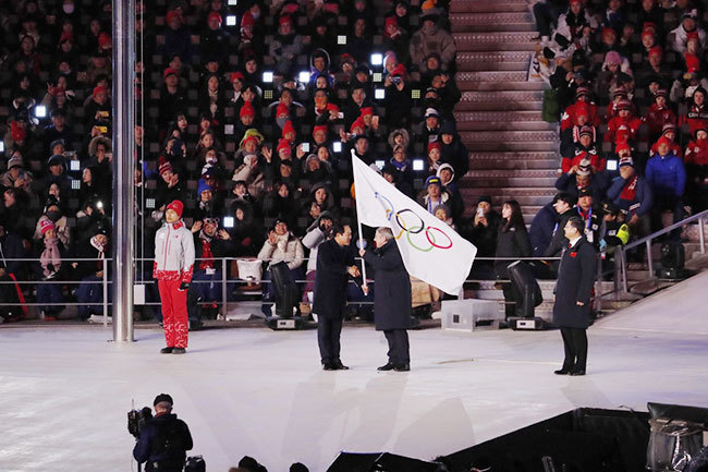 オリンピック旗は、フラッグハンドオーバーセレモニーで、国際オリンピック委員会のトーマス・バッハ会長から次回開催都市引の北京市長に手渡され、北京市は、ダンサーやロボットによる約8分間のパフォーマンスを披露。習近平国家主席が「中国人民は、世界中の皆さんを歓迎します。2022年に北京で会いましょう」とビデオメッセージを寄せた。