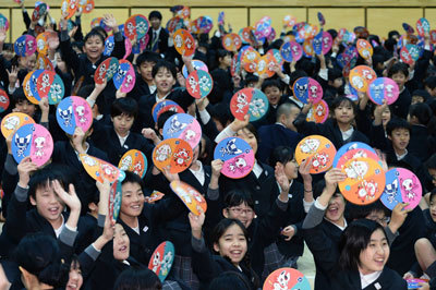 会場には、学園の児童約560人と報道関係者約300人が集まり発表を見守った。キャラクター大国で開催される大会のマスコット発表とあってか、海外メディアの姿も目立った。