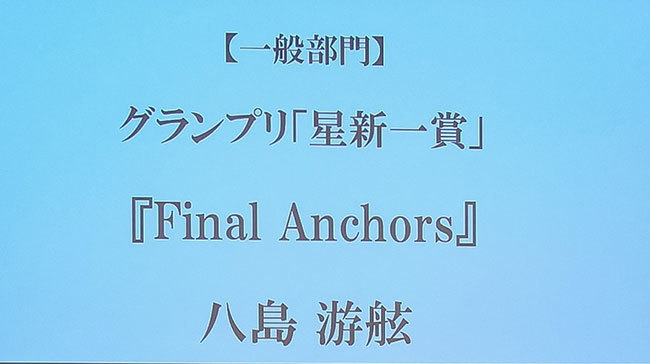 今回は一般部門1766作品、学生部門162作品、ジュニア部門281作品の応募があり、一般部門グランプリは八島游舷氏の「Final Anchors」、学生部門グランプリは松尾泰志氏の「冷蔵庫狩り」、ジュニア部門グランプリは天波氏の「シズク」がそれぞれ受賞した。