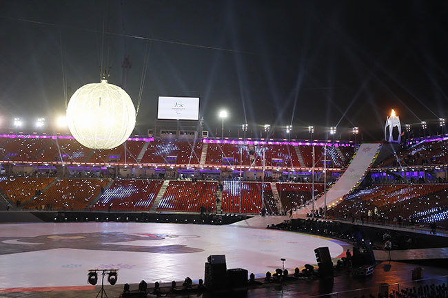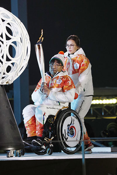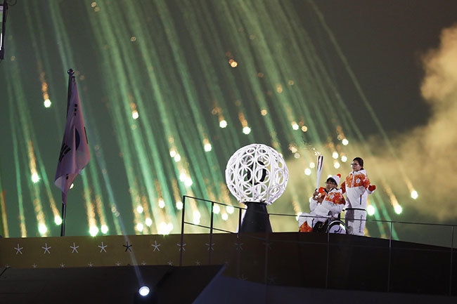 聖火は、韓国代表のソ・スンソク選手(車いすカーリング)と、オリンピックのカーリング女子で注目を集めた“メガネ先輩”ことキム・ウンジョン選手の手で聖火台にともされた。