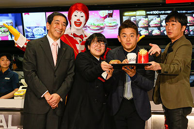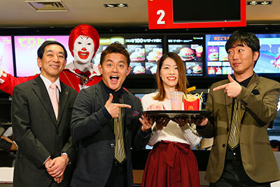 サービス開始の5時を前に、週に1度はマクドナルドで食事するというお笑いコンビ・スピードワゴンがゲストとして登場した。井戸田潤さんは「男はハンバーガーが好きだから、お腹がすくと2、3個は食べてしまう。このサービスは本当にうれしい」と喜びのコメント。相方の小沢一敬さんは「プラス100円で倍にしてもらえるなら、200円だとさらに増えるの?」と冗談交じりにきくが「それは店長と相談してください」とドナルドに軽くあしらわれ苦笑い。