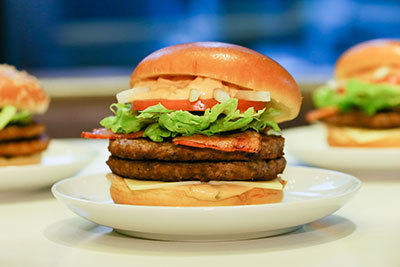 サービス開始まで残り15分と迫る中、2人はパティが倍になった「倍バーガー」を試食。