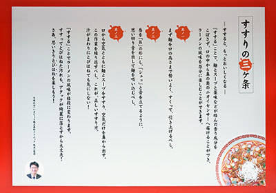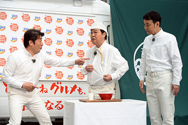 全身白い衣装で登場したダチョウ倶楽部の3人は、会場ではラーメン1杯が300円と知り、「おいおい、聞いてないよ~!」と、早速定番のギャグをとばした。また、ラーメンを食べるとき、約半数の人がすすって食べないと聞くと、グルメを自認する寺門ジモンさんは「すすらないでどうする!すすらないとおいしくない!」と、すすりの重要性を強調。特製ラーメンの試食では、いつもの譲り合いの末にいつも通り上島竜平さんが食べることに。そして、これも定番の“おでん芸”ならぬ“ラーメン芸”で、上島さんのシャツには食べこぼしがくっきり付いた。