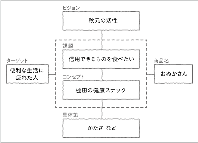 十字フレームを使ってまとめるとこんな感じ。「棚田の健康飲料」で「便利な生活に疲れているひと」の「信用できるものを食べたい」という気持ちを解決する乳酸菌と麹の健康飲料「ちほまろ」によって「秋元の活性化」を目指しているという整理です。乳酸発酵した甘酒という商品自体は他にも販売している事業者さんがいらっしゃいます。しかし寒暖差が激しく、水に恵まれ、手塩にかけて育てた「棚田」のお米でつくるところに、そして限界集落を元気にするのだという思想に、多くの人がわざわざ「ちほまろ」を選ぶ理由があるのでしょう。