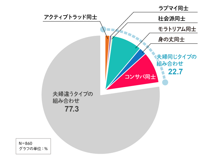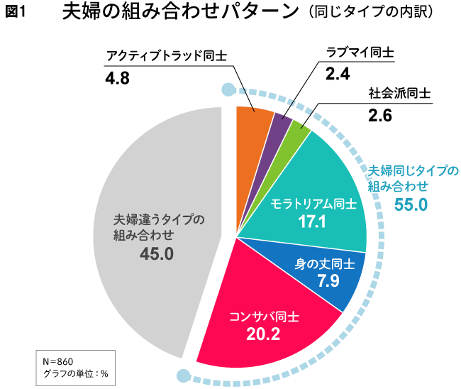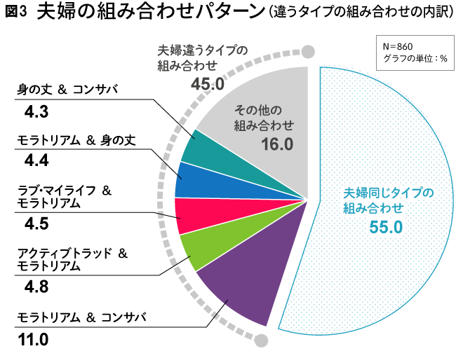 ちなみに、最も少なかったのは「ラブ・マイライフ&淡々コンサバ」の組み合わせ(0.9%)。どちらが夫であれ妻であれ、最もアグレッシブなタイプと最も平穏を愛するタイプは共存しにくいのかもしれません。