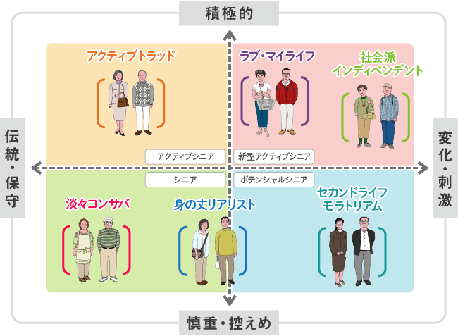 淡々コンサバ:現在の生活に十分満足していて、これ以上に多くを望まない。強い主張をももたず、日々淡々と平穏な暮らしを送っている。従来言われてきた「高齢者」イメージに最も近い。