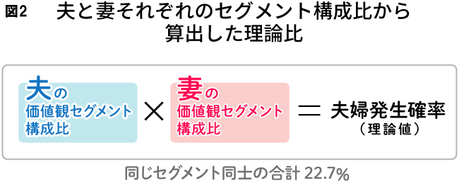 実は、単純に夫婦それぞれのセグメントの構成比から推計すると、理論上は同じタイプ同士の組み合わせが発生する確率は2割強という数字でした(図2)。