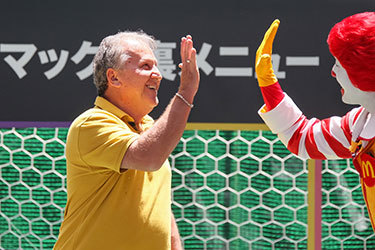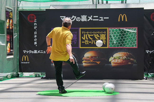 お薦めメニューのパネルを的にしたキックターゲットチャレンジでは、一発も外すことなく右から順に命中させ、「サッカーの神様」と称えられた往年の高精度なフリーキックを披露。予備のボールをドナルドに手渡し「久しぶりに蹴るので、昨夜はずっとキックの練習をしていた」と笑みを見せた。