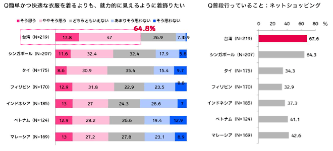 アジア女子まるわかり定量調査によれば、「簡単かつ快適な衣服を着るよりも、魅力的に見えるように着飾りたい」意識が調査対象国・地域の中で最も高く、64.8%に及びます。