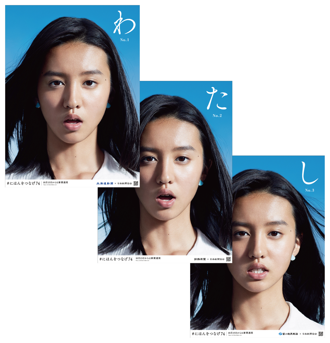 モデルのkoki,さんが登場する各紙の広告の右上に、平仮名を1文字ずつ掲載。74紙の原稿を北から南へと順番に並べると、以下のメッセージになるという仕掛けだ。
