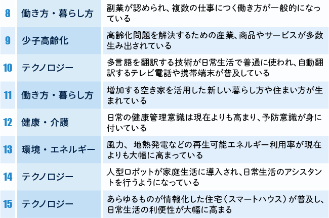 表1は、生活者が考えた「なっていてほしい社会」のランキング・ベスト15です。ランクの上位を占めたのは、主に少子高齢化課題が解決された社会、新しい働き方や暮らし方が実現した社会に関する項目が中心でした。