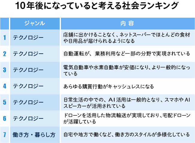 「ネットスーパーでほとんどの食材や日用品が届けられる」(1位)、「自動運転が、業務利用など一部で実現される」(2位)、「電気自動車や水素自動車がより一般的になる」(3位)、「あらゆる購買行動がキャッシュレスになる」(4位)、「日常生活の中でのAI活用が一般的になる」(5位)、「ドローンを活用した物流輸送が実現している」(6位)などが上位を占めています。それらの項目は、すでに一部は実現しているものもあり、現在の延長線上で10年後を現実的に捉えようとしていることが理解できます。