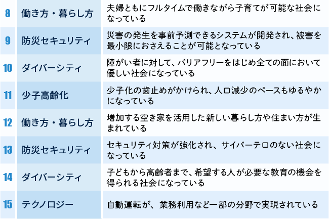 働き方や暮らし方では、「自宅や地方など、働き方のスタイルが多様化している」(4位)、「低成長でも、幸福感を持ち暮らせる社会」(5位)、「夫婦ともフルタイムで働きながら子育てが可能な社会」(8位)、「障がい者に対しバリアフリーをはじめ全ての面で優しい社会」(10位)などが上位に挙がっています。