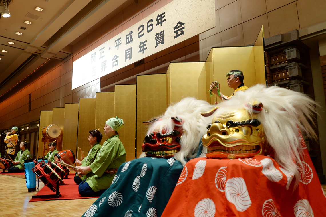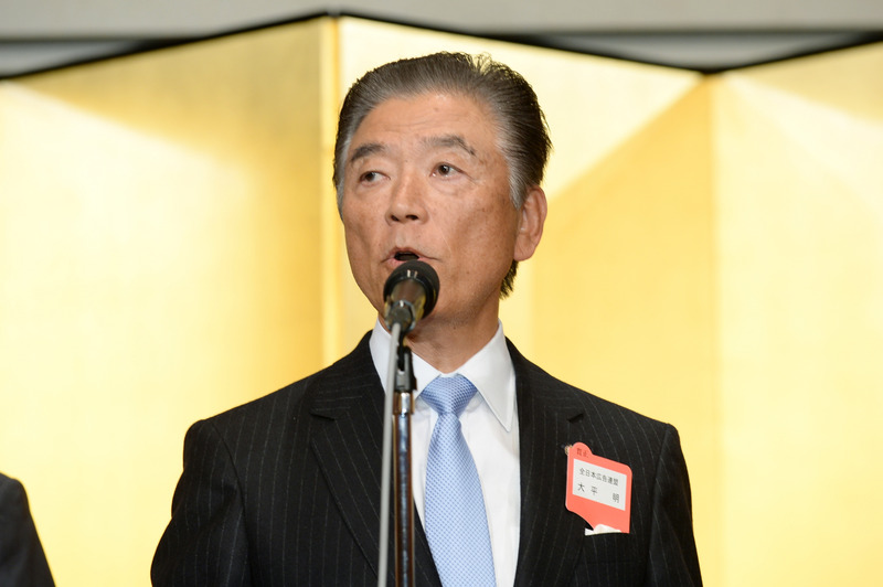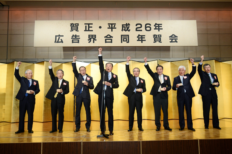 共催者を代表してあいさつに立った全広連の大平理事長は「広告界にとって輝かしい年となるよう祈念する。昨年は日本復活の年、伊勢神宮や出雲大社の遷宮で神様もよみがえった。今年の干支は甲午(きのえうま)。長く寒い冬が終わり春になり大地が殻を破って根を伸ばし、天に向かってエネルギーを発散するといわれ、今年こそ飛躍の年となる。しかし、時代が変わり今までの常識が通用しなくなり、広告の概念が広がりメディアの概念が変化する。新しい時代に合った変化を求めていかなければならない。広告の元気が日本を元気にするよう、今日は新時代の出陣式にしたい」と語り、「エイ、エイ、オウ」の掛け声で力強く拳を突き上げた。