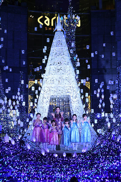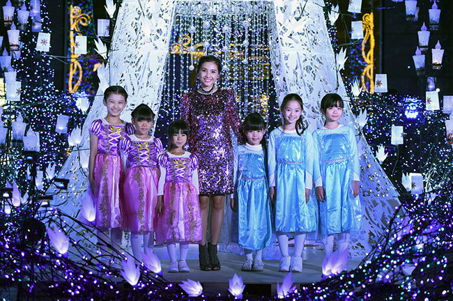 ビバリーさんは、ドレスで着飾った子どもたちとカウントダウンで点灯し、イルミネーションが輝く中でミニライブを実施した。