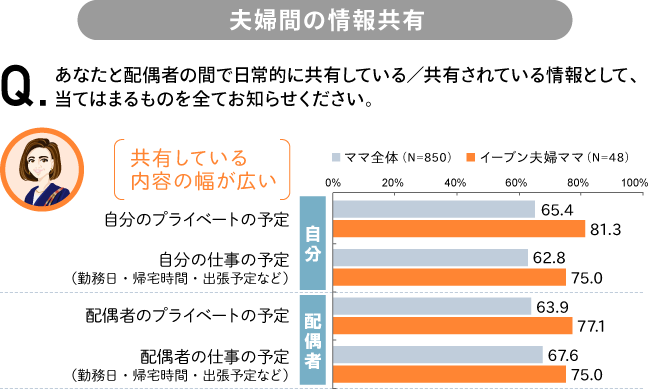 イーブン夫婦の特徴として、夫婦間での情報共有内容の幅が広い、共有のために使うツールも幅広い、ということがあります。