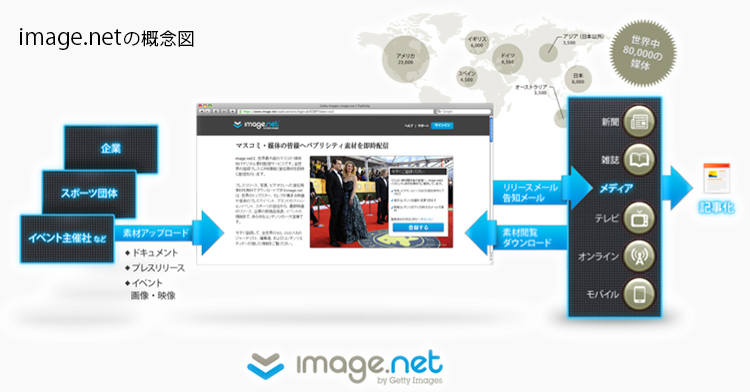 image.net (http://www.image.net/)は、世界70カ国以上で80,000ものメディアにコンタクトできる、世界最大規模のPR素材オンライン配信サービス。その特徴は、テレビ局や大手新聞、雑誌、オンラインメディアなど、image.netに登録した世界の報道機関に、そのまま報道として即利用できる静止画や動画素材などのリッチコンテンツをタイムリーに配信できること、およびメディアによる素材へのアクセス履歴や掲載媒体の確認が容易にできる点にある。