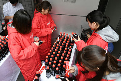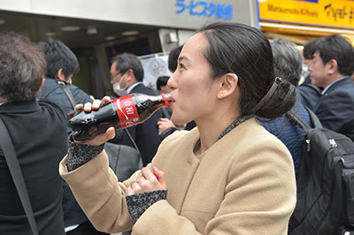 特別なボトルを手にした人たちは「発表は見られなかったが、ボトルをもらえてうれしい。会社や家で自慢する」「号外は無理だったが、コカ・コーラの方がうれしい」などと笑みを見せ、早速その場で飲んだ人は「やっぱり爽やか。新元号の味がする」と特別な日を楽しんでいた。