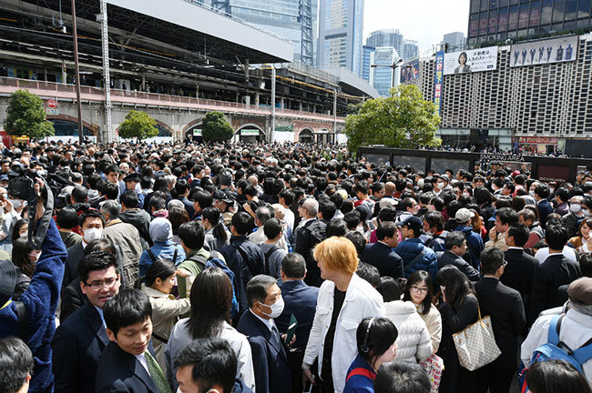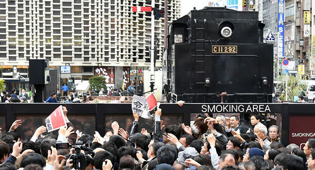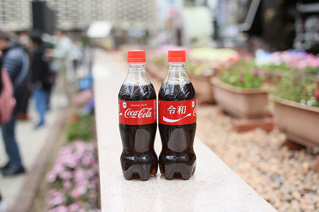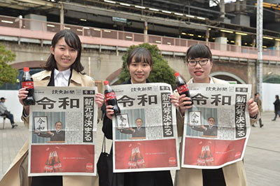 東京のJR新橋駅前のSL広場では、新聞社の号外を待ちわびる群衆が詰め掛ける中、日本コカ・コーラが新元号のラベルをまとったコカ・コーラボトルのサンプリングを実施した。