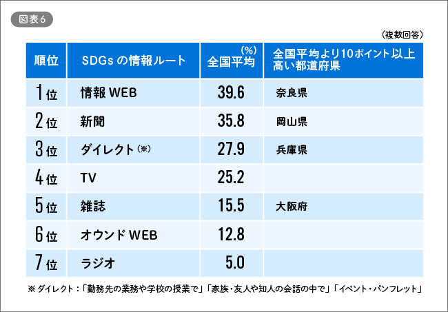 SDGsの情報源は、全国では「情報WEB」(39.6%)や「新聞」(35.8%)が30%を超えています。「新聞」は「地方紙」の割合も多く、また、第3位に「勤務先の業務」「学校の授業」「イベント」や「周りの人との会話」などの「ダイレクト」が出てきているのも、SDGsの浸透の仕方の特徴といえます。