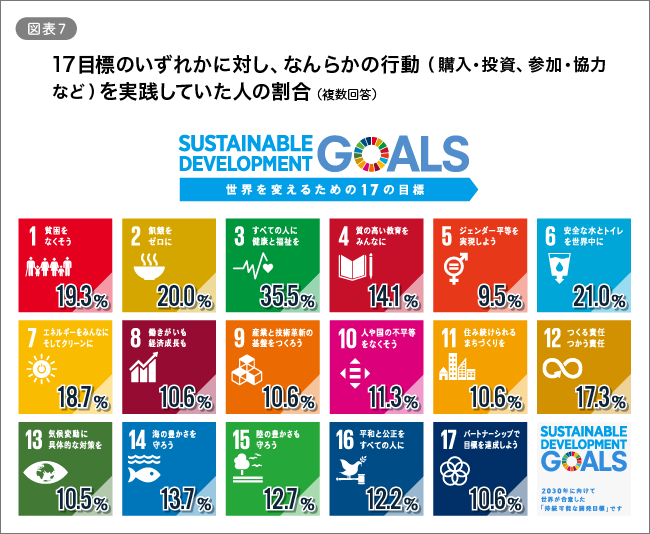 SDGsの名称を知っていた、知らなかったに関わらず、一番実践されていた目標は、3の「健康」(35.5%)でした。次いで6の「水と衛生」(21.0%)、2の「飢餓」(20.0%)1の「貧困」(19.3%)と続きますが、最も自分ごと化しやすい「健康」とは10ポイント以上の差がついています。