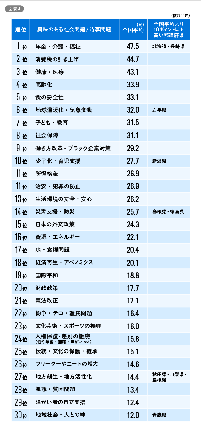 全国1位に挙がったのは「年金・介護・福祉」(47.5%)の問題。第2位の「消費税の引き上げ」(44.7%)や第3位「健康・医療」(43.1%)など、自分の将来不安に直結しそうな項目が上位に挙がりました。