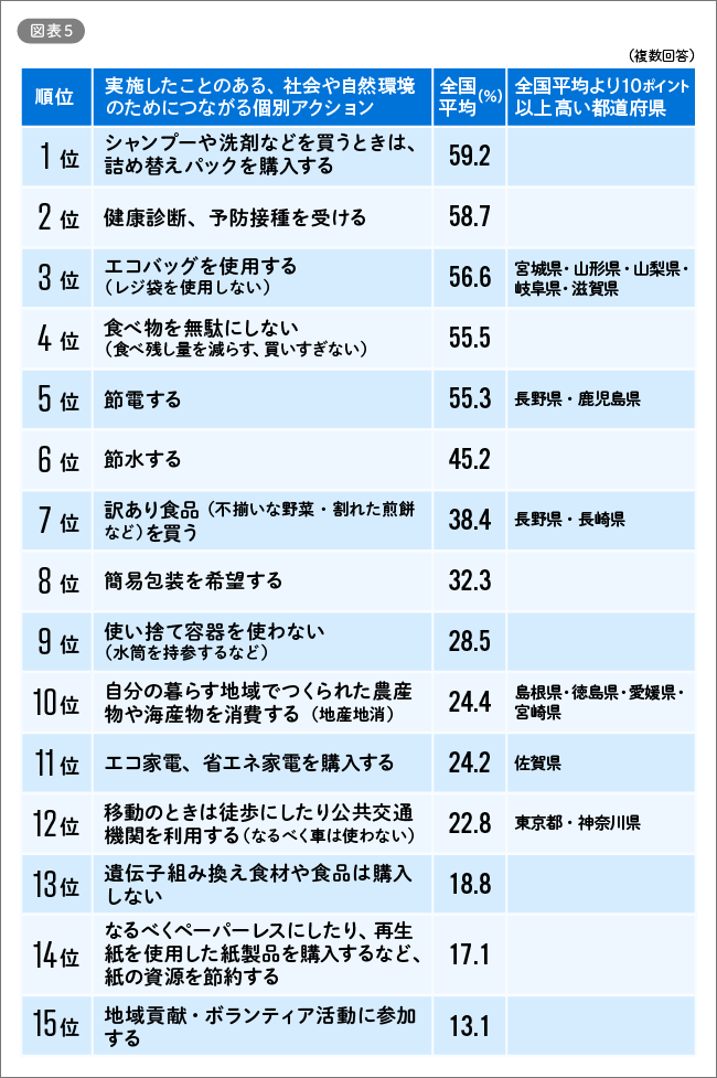 SDGsを知らなかったり、意識していなくても、SDGsに取り組んでいる場合があります。そんな取り組みのランキングで最も高かったのは「詰め替えパックの利用」(59.2%)。これは、経済的な側面もあるためか、「健康診断、予防接種」(58.7%)をわずかに上回り、ほぼ6割が「実施したことがある」と回答しました。気軽にできてオシャレ感もある「エコバッグの使用」(56.6%)、フードロス問題の浸透からか「食べ物を無駄にしない」(55.5%)も上位に挙がっています。「節電」(55.3%)と「節水」(45.2%)では同じ節約でも実施率に10ポイント以上の差が見られることから生活に密着した「取り組みやすさ」がポイントといえるでしょう。