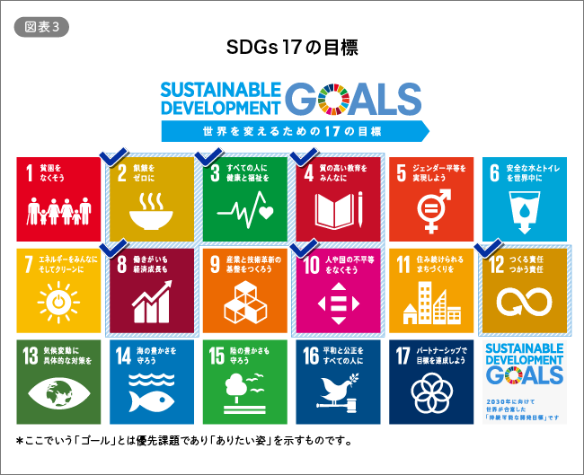 岡山県では、SDGsの名称だけでなく内容まで知っている人が多く、17の目標(図表3)のうちの六つの目標で、全国平均よりも10ポイント以上高い認知率になりました。