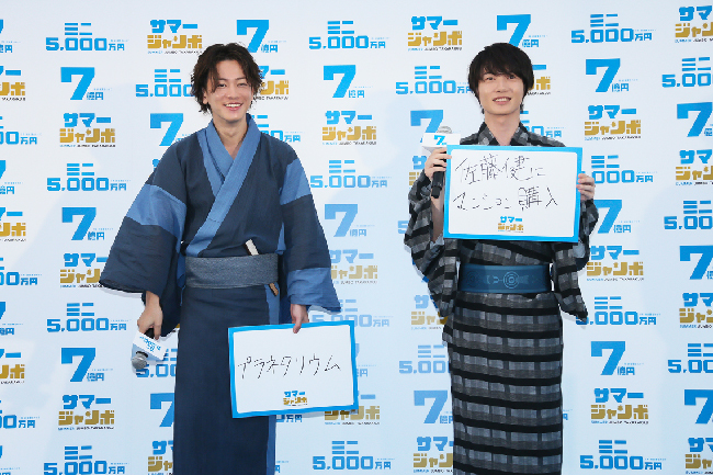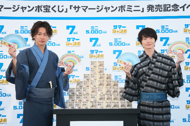 トークセッションでは、ジャンボ宝くじの新テレビCMに出演している俳優の佐藤健さんと「ビンゴ5」などのCMに出演している神木隆之介さんが浴衣姿で登場した。
