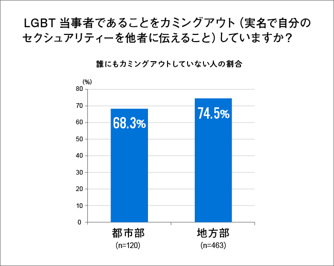 「あなたは、LGBT当事者であることをカミングアウト(実名で自分のセクシュアリティーを他者に伝えること)していますか?」と聞いたところ、誰にもカミングアウトしていないという人が、都市部の9都府県で68.3%となった一方、地方部では74.5%と、より高い結果となりました。