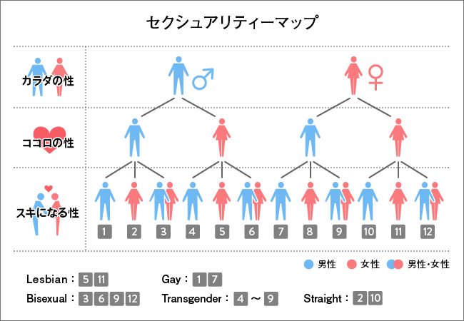 ※電通のダイバーシティ・ラボの「LGBT調査」は、便宜上、LGBTなどのセクシュアル・マイノリティーに該当する人を「LGBT層」と呼んでいます。これは、「セクシュアリティーマップ」(セクシュアリティーを身体の性、心の性、好きになる相手の性に分けたもの)の2と10(ストレート:生まれた時に割り当てられた身体の性と性自認が一致しており、異性愛者である人)以外の方々と規定しています。LGBT層「8.9%」の中には、「クエスチョニング(Q):自分の性自認や性的指向を決められない・決まっていない人」やその他も含まれています。そうした意味でも、DDLが2012年、2015年、2018年に行った「LGBT調査」は、実質的にはすべてLGBTQ⁺調査であったといえます。