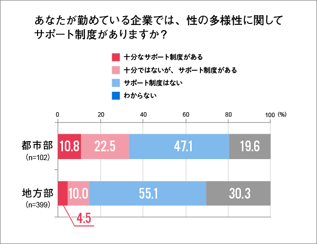 最後に、「あなたが勤めている企業では、性の多様性に関してサポート制度がありますか?」という問いに対し、都市部では十分ではないにせよ33.3%の人がなんらかのサポート制度があると回答した一方、地方部では14.5%のみと、都市部と大きな開きがあることが分かりました。