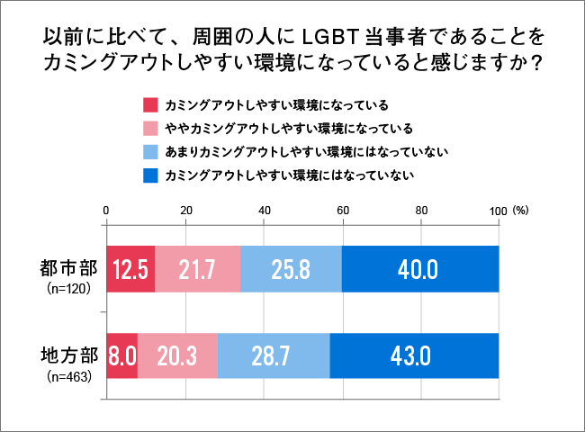 また、「以前に比べて、周囲の人にLGBT当事者であることをカミングアウトしやすい環境になっていると感じますか?」という問いに対しても、都市部では34.2%の人がカミングアウトしやすい環境になってきている、ややカミングアウトしやすい環境になってきていると回答した一方、地方部に関しては、28.3%にとどまる結果となりました。少しずつ改善が進む都市部に比べ、地方部の方が進みが遅いといえます。